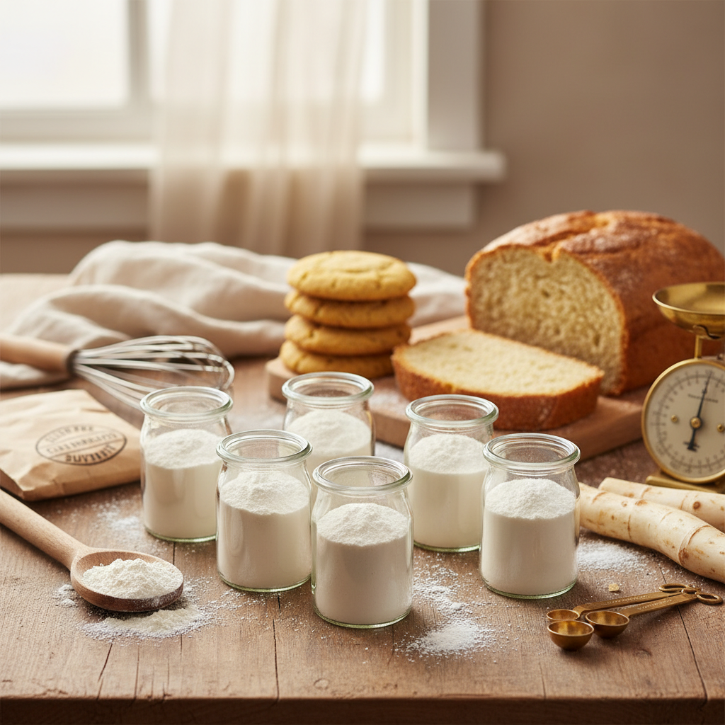 Arrowroot starch typically makes up 15-25% of a gluten-free flour blend by weight. It works alongside a base flour (like brown rice flour or cassava flour) and usually a binding agent like xanthan gum or psyllium husk.